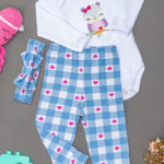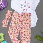 Detalhes: Body Longo em Suedine 100% Algodão com Bordado de Sorvetinho no decote frente, abertura envelope na gola, e botões de pressão entre as perninhas para facilitar a troca. Calça estampada feita em 96% Poliéster e 4% Elastano, com elástico na cintura. O conjunto acompanha Faixa Laço de cabelo, no mesmo tecido e estampa da calça.