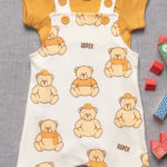 Detalhes: Body com fechamento em botões de pressão e gola envelope para facilitar a entrada da cabeça. Jardineira com alça regulável em botões e estampa unissex de Ursinho.
