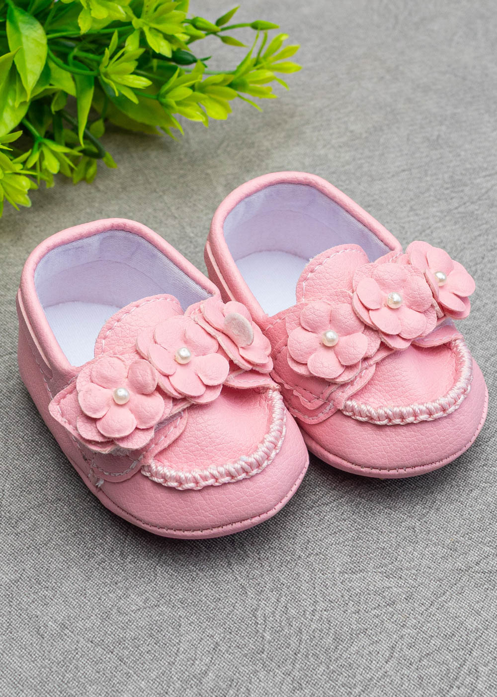 Detalhes: Mocassim em couro sintético na cor Rosa com Flores e Velcro.